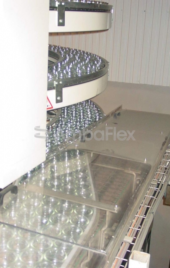 The AmbaFlex patented belt with lateral roller guides permits multiple windings. This innovative solution allows a much more effective layout for filling lines. The SpiralVeyor SVm saves valuable floor space compared to traditional straight inclined chain conveyors. It also compares very favorably to side grip elevators. It eliminates the need to combine lines, enabling a compact line design. Thousands of SpiralVeyor’s are currently operational world-wide.